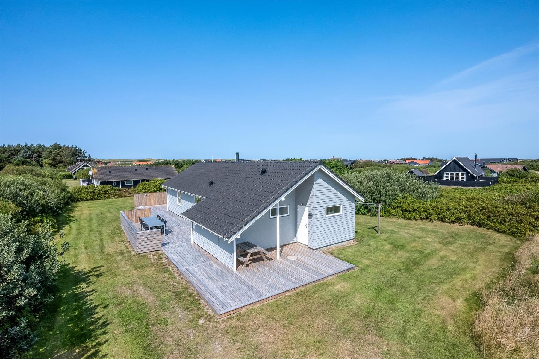 Wenn die Sonne scheint und die Tage lang sind, verlagert sich das Urlaubsleben nach draußen. Die große Holzterrasse von 80 m² bietet reichlich Platz, um sich in einem Liegestuhl zurückzulehnen, die Mahlzeiten unter freiem Himmel zu genießen oder vielleicht einfach nur ein gutes Buch im Schatten zu lesen. Im Osten ist ein 20 m² großer Teil der Terrasse überdacht, sodass du immer ein angenehmes Plätzchen findest – auch wenn abends der Tau fällt oder die Sonne tief steht. Die Bäume rund um das Grundstück bieten nicht nur Windschutz, sondern auch eine ganz besondere Atmosphäre von Privatsphäre und Ruhe, wie man sie nur selten findet. Hier ist Platz für Kinder, Erwachsene und Hunde – und Zeit, einfach mal innezuhalten.