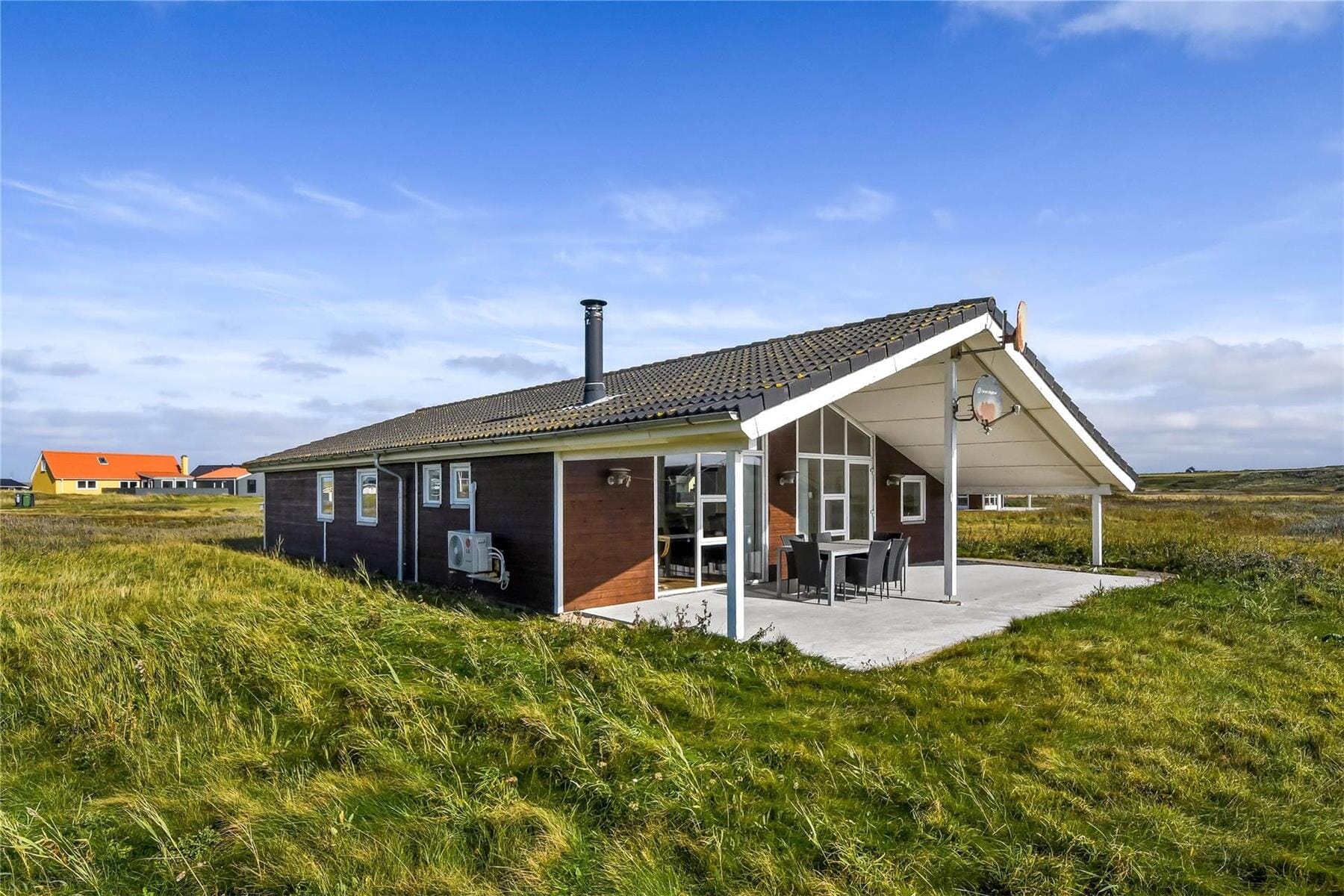 Der Garten rund ums Ferienhaus ist ein echtes Highlight. Auf dem großen Grundstück können die Kinder sicher in der Sandkiste spielen oder auf den Schaukeln toben, während sich die Erwachsenen auf der Terrasse erholen. Sowohl eine offene als auch eine überdachte Terrasse machen es leicht, je nach Wetterlage ein gemütliches Plätzchen zu finden – ob in der Sonne oder im Schatten. Die Mahlzeiten schmecken unter freiem Himmel gleich noch besser, und mit einem guten Buch in der Hand und Blick in die Natur lässt sich die Urlaubsstimmung voll auskosten. Der kurze Weg zum Strand bedeutet, dass ihr jederzeit spontan einen Spaziergang machen oder euch die frische Meeresbrise um die Nase wehen lassen könnt. Insgesamt ist der Außenbereich perfekt für Spiel, Entspannung und wertvolle Familienzeit im Freien.