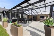 Zum Haus gehört auch eine schöne, teilweise überdachte, Terrasse mit Gartenmöbeln, Liegestühlen und Grill. Auf dem 1200 m² großen Grundstück mit Gartenbereich findet man auch einen Sandkasten und eine Schaukel.