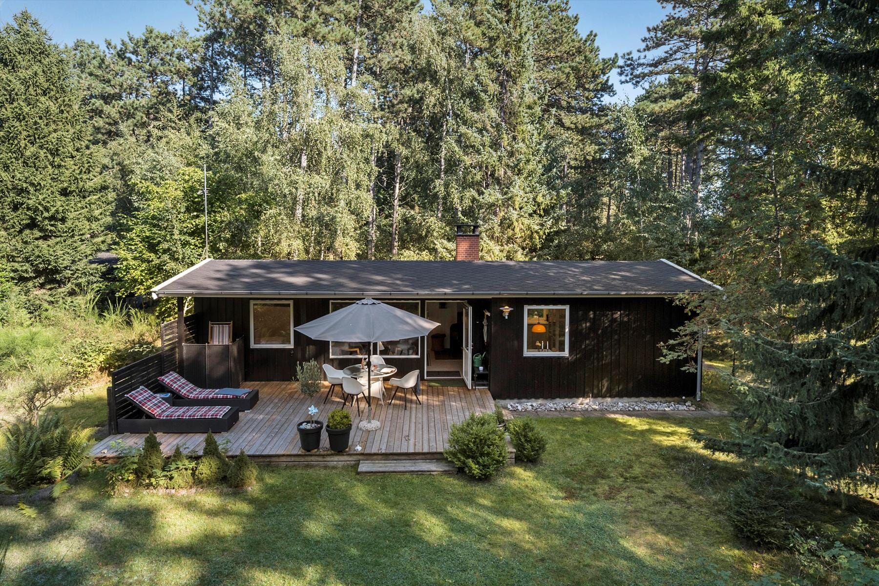 Genieße das Leben draußen: Tritt hinaus in die schöne Umgebung mit den herrlichen Kiefern, lies ein gutes Buch auf der schönen Holzterrasse – und genieße die frische Waldluft in vollen Zügen. Komm der Natur hier ganz nah, denn mit etwas Glück kannst du eine Vielzahl von Vogelarten, Rehe, Fasane und Eichhörnchen auf dem Grundstück beobachten. Mache einen kleinen Ausflug vom Sommerhaus, gehe 500 Meter und genieße ein erfrischendes Bad am Strand oder erkunde das wunderbare Gebiet auf einem längeren Spaziergang. Beende die Sommertage stilvoll, indem du unter freiem Himmel grillst und das Outdoor-Erlebnis voll zur Entfaltung bringst.